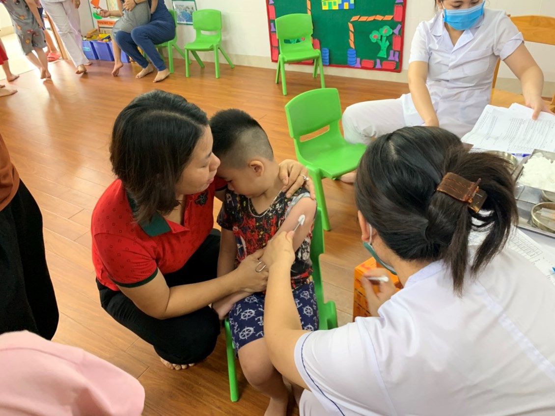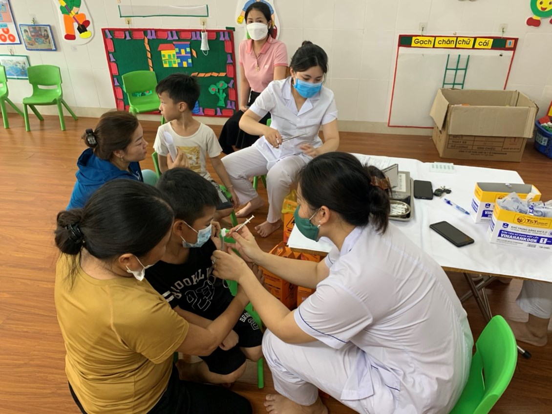 Phụ huynh đã đưa trẻ đến điểm tiêm đúng thời gian thông báo. Trong quá trình tiêm các bé được các cán bộ y tế khám sàng lọc, chăm sóc các bé chu đáo sau khi tiêm xong. Bé nào cũng mạnh dạn, tự tin và không có bê nào khóc nhè đâu nhé