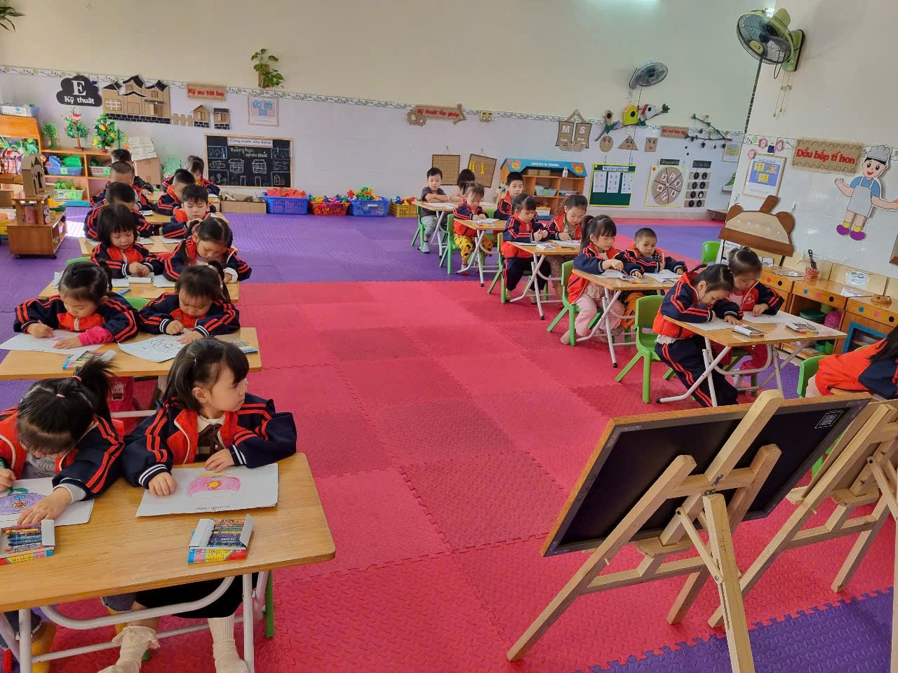 Tập vẽ và tô màu là một cách để trẻ phát triển kỹ năng vận động tinh mà sau này trẻ sẽ cần đến khi học viết. Kỹ năng vận động tinh là khả năng điều khiển và phối hợp các cử động của bàn tay để hoàn thành các công việc như viết chữ, buộc dây giày hoặc dùng đũa hoặc dĩa để ăn.